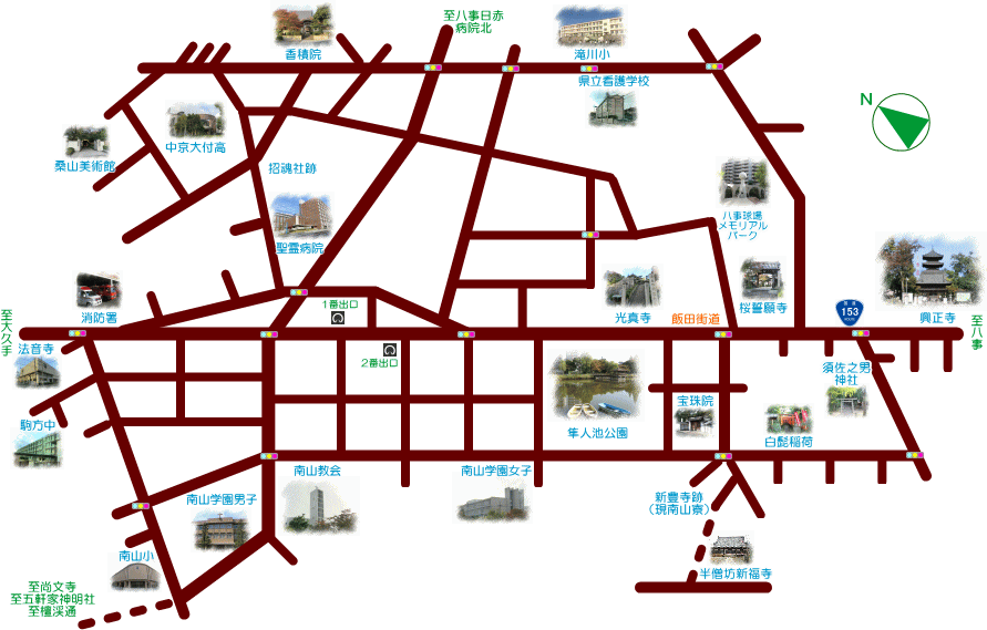 また住むのに最適な清閑な雰囲気、あらゆるお店が集まった便利さに加え、隼人池など憩いの場があることや、美術館や櫻誓願寺、八事山興正寺、須佐之男神社等の歴史ある神社仏閣も多く文化の街でもあります。